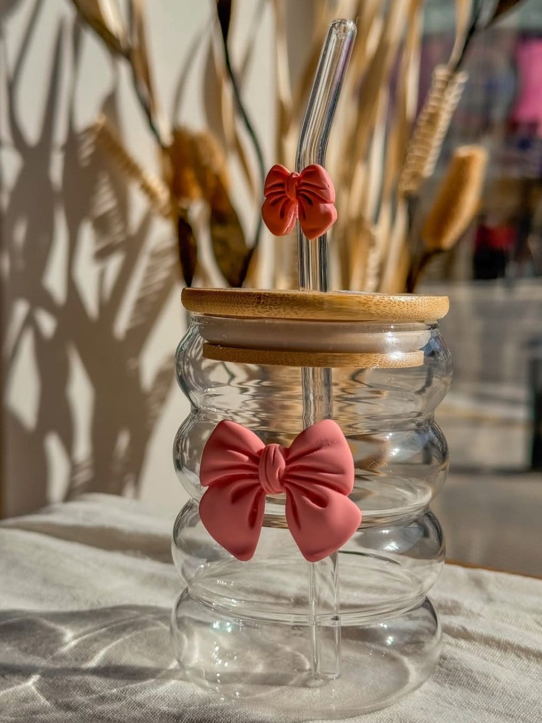 Complete Set with Lid and Straw: Each bow glass cup comes with a matching lid and straw, providing a convenient and enjoyable drinking experience. The lid helps to maintain the temperature of your beverage and prevents spills, while the straw allows for easy sipping. This complete set is perfect for enjoying your favorite drinks on the go or at home.